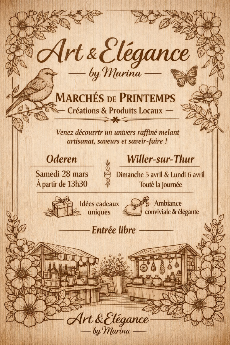 Bienvenue dans la boutique Art & Elégance by Marina, où chaque gravure raconte une histoire. Découvrez des créations uniques, entièrement personnalisables, parfaites pour toutes les occasions. Explorez notre collection et trouvez le cadeau idéal ou l'objet d'art qui vous ressemble. Nous sommes basés en Alsace, dans le Haut-Rhin, mais notre passion rayonne partout en ligne !